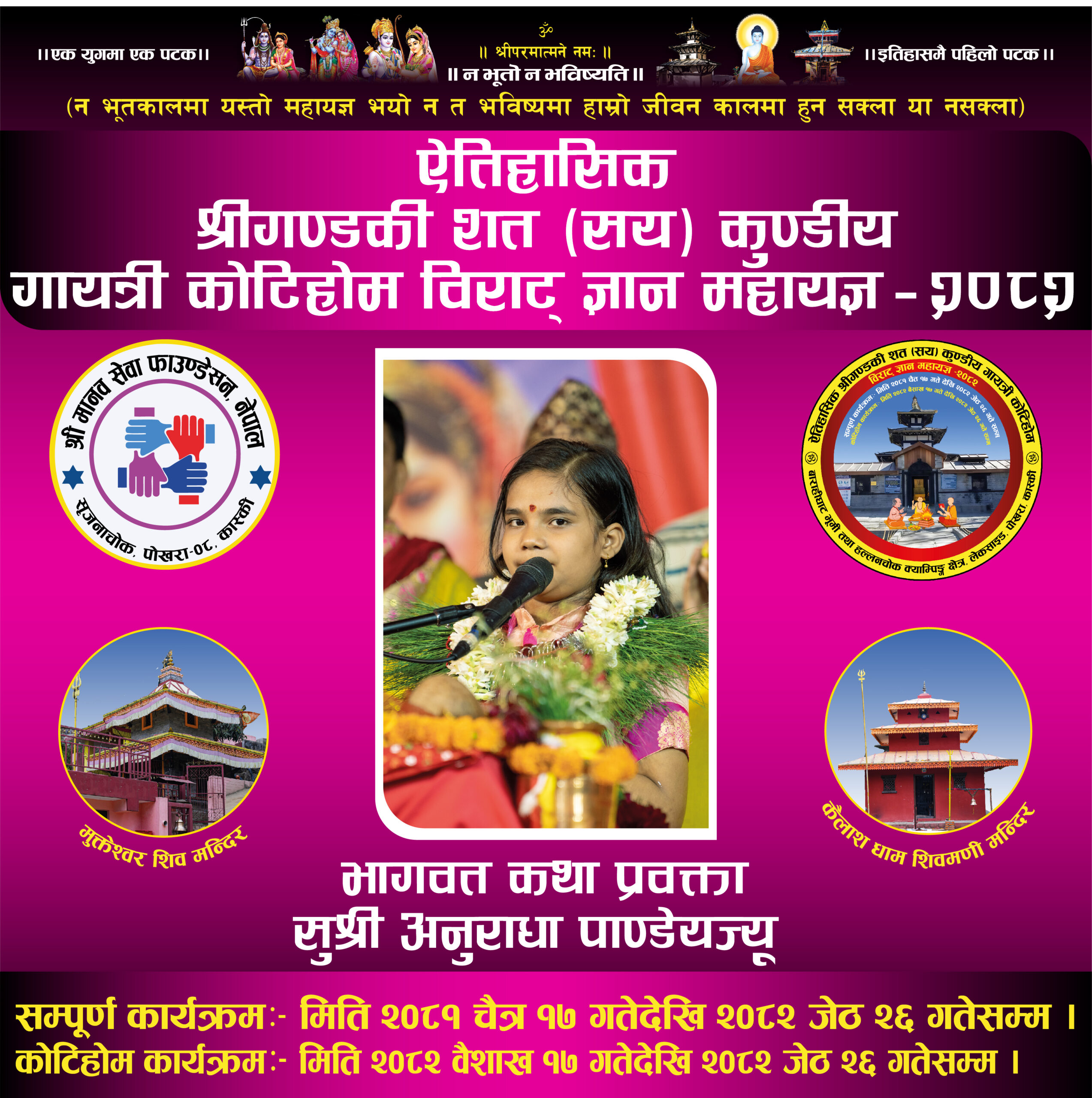 विश्वकै कान्छि भागवत वाचिका बालविदुषी अनुराधा पाण्डेयले श्री गण्डकी कोटिहोम महायज्ञमा चैत्र २९ गते बाट कथा प्रवचन सुरु गर्दै हुनुहुन्छ । विश्वकै कान्छि भागवत वाचिका अनुराधा पाण्डेयले श्री गण्डकी कोटिहोम महायज्ञ चैत्र २९ गते बाट कथा प्रवचन सुरु गर्ने पोखरा महानगरपालिका वार्ड नं. १७ बिरौटामा सञ्चालन हुन लागेको ऐतिहासिक श्री गण्डकी शत कुण्डीय गायत्री कोटिहोम…