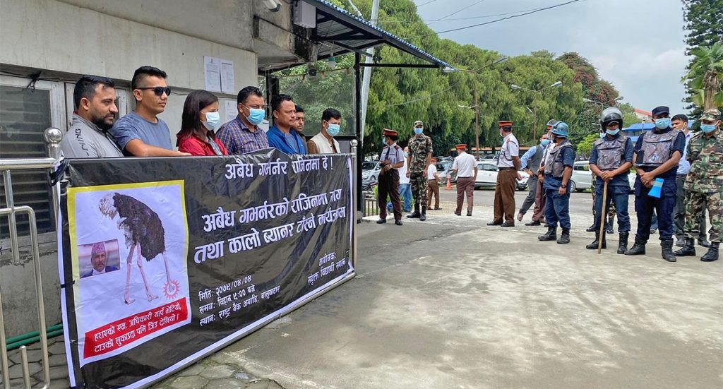 गभर्नर महाप्रसाद अधिकारीको राजीनामा माग्दै प्रदर्शन गर्दै आएका नेपाली कांग्रेस, माओवादी केन्द्र र नेकपा एकीकृत समाजवादी निकट विद्यार्थीहरुले आज बालुवाटारस्थित राष्ट्र बैंक कार्यालय परिसरमा कालो ब्यानर टाँगेका छन् । यसअघि १ साउनमा नेविसंघ र अखिल क्रान्तिकारीले बालुवाटार क्षेत्रमा प्रदर्शन गरेका थिए । प्रदर्शनमा प्रहरीले हस्तक्षेप गर्दा केही विद्यार्थीहरु घाइते भएका थिए । गभर्नरको गलत नीतिका…